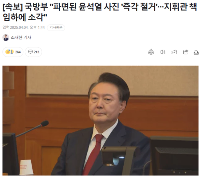 헌법재판소가 윤석열 전 대통령을 파면하자 곧바로 국방부가 전군에 있는 윤 전 대통령 사진 철거 조치에 나섰습니다.