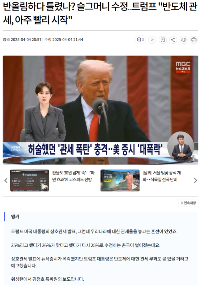 자동차 25% 관세에 이어, 이로써 한국의 대미수출 1, 2위 품목이 모두 관세를 맞게 됐습니다.