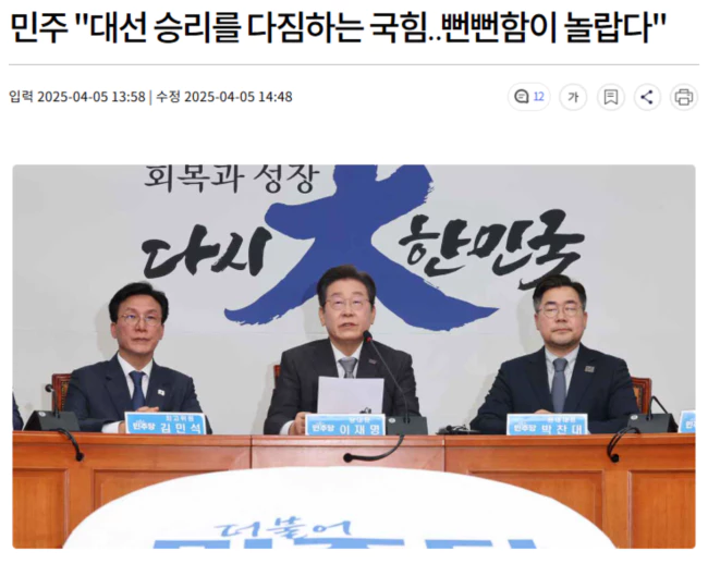 민주당은 "자신들이 배출한 대통령이 내란을 일으켜 파면됐는데, 아무 일 없었다는 듯 대선 승리를 다짐하는 이들의 뻔뻔함이 놀랍다"며, "윤석열 정부 내내 실정과 폭정을 방관했던 국민의힘은 12.3 내란 이후에도 그를 옹호하기에만 바빴다"고 지적했습니다.