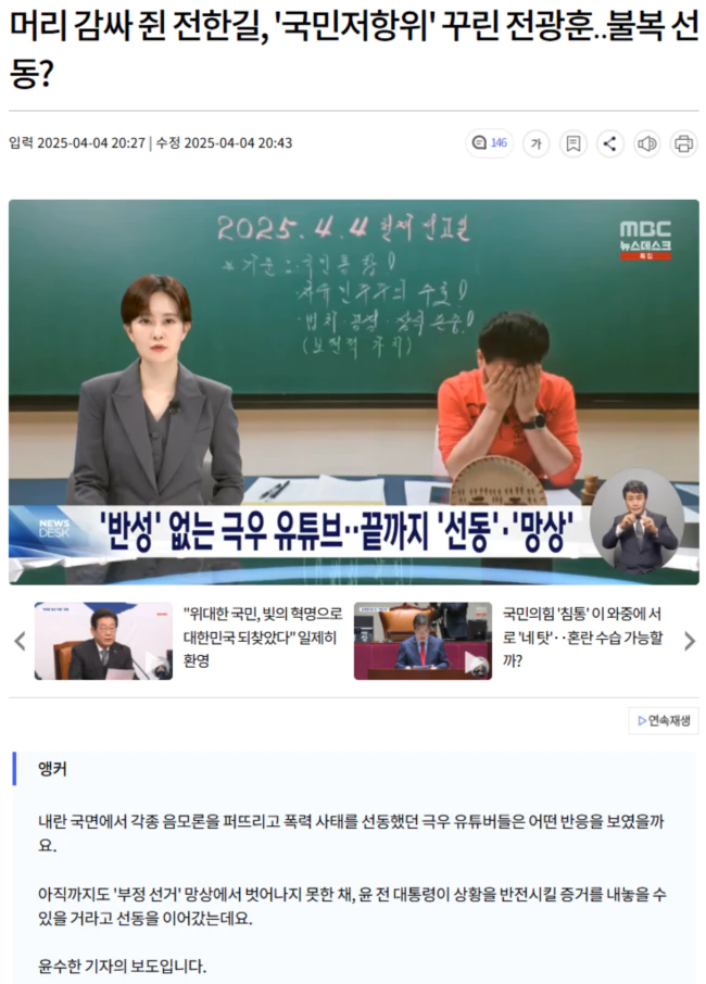 그러면서도 이미 파면을 예감했다는 듯, "어제 300여 명으로 구성된 국민저항위원회를 구성했다"며 내일 광화문 집회를 시작으로 본격 저항에 나설 거라고 예고했습니다.
