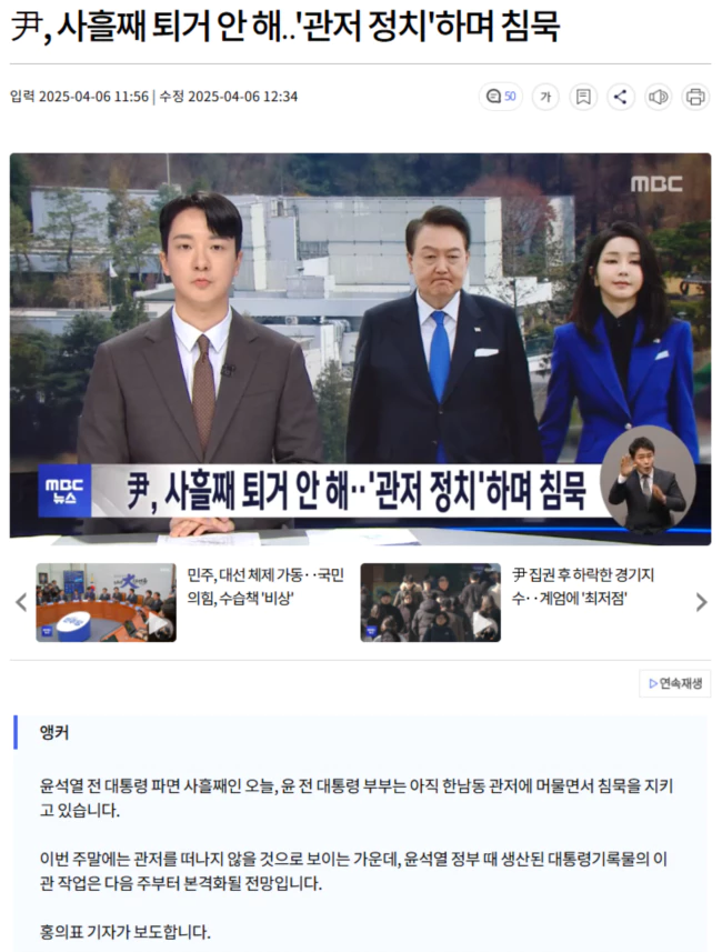 윤석열 전 대통령 부부는 파면 사흘째인 오늘도 서울 한남동 관저에 머무르고 있습니다.