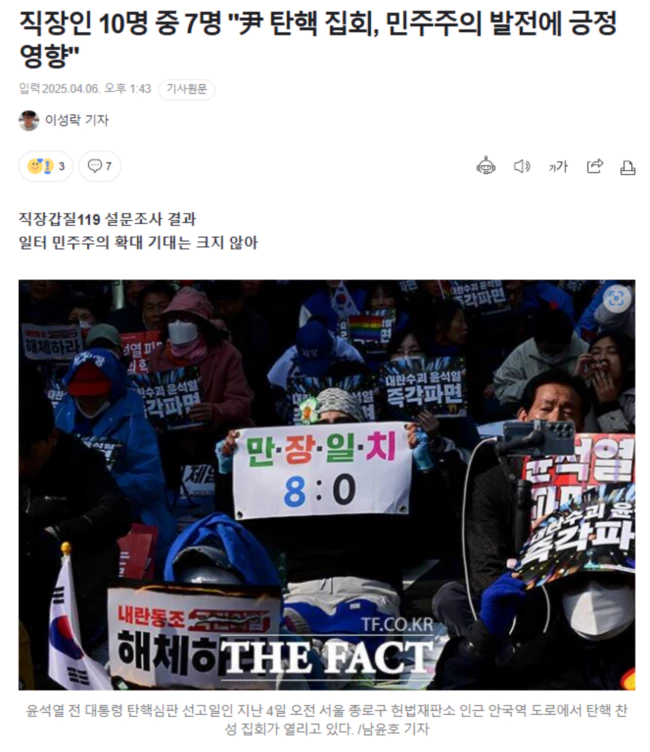 6일 직장갑질119가 여론조사 전문기관 글로벌리서치에 의뢰해 지난 2월 10일부터 2월 17일까지 전국 만 19세 이상 직장인 1000명을 대상으로 설문조사를 진행한 결과에 따르면 응답자 68.7%는 탄핵 촉구 집회가 한국 사회 민주주의 발전에 긍정적 영향을 끼쳤다고 응답했다.