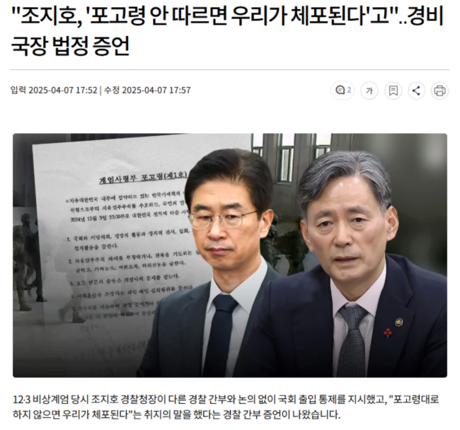 임 국장은 또 "조 청장이 '포고령대로 하지 않으면 우리가 체포된다'고 확실히 얘기했느냐"는 조 청장 변호인 질문에 "명확히 기억난다. '체포당할 수 있다'는 말씀이었다"고 했습니다.