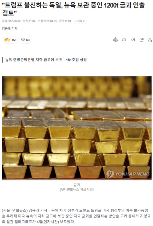(출처 : "트럼프 불신하는 독일, 뉴욕 보관 중인 1200t 금괴 인출 검토")