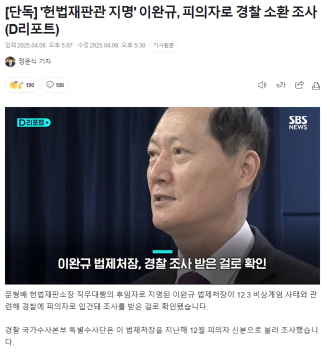 (출처 : [단독] '헌법재판관 지명' 이완규, 피의자로 경찰 소환 조사)