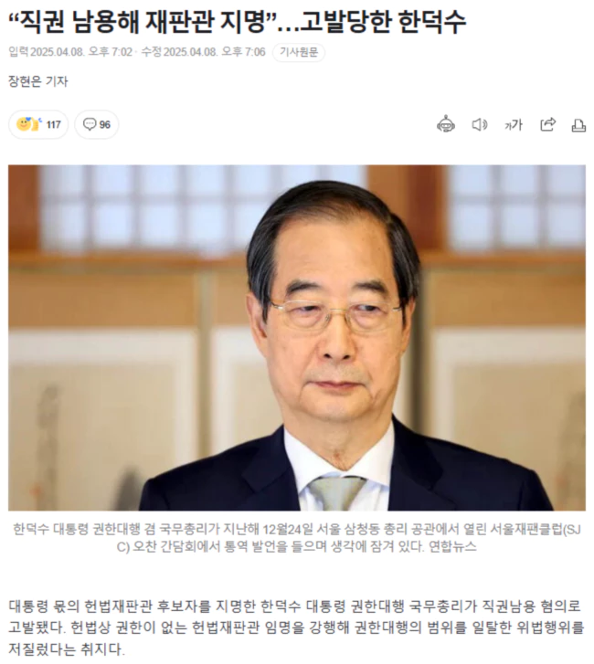 (출처 : “직권 남용해 재판관 지명”…고발당한 한덕수)