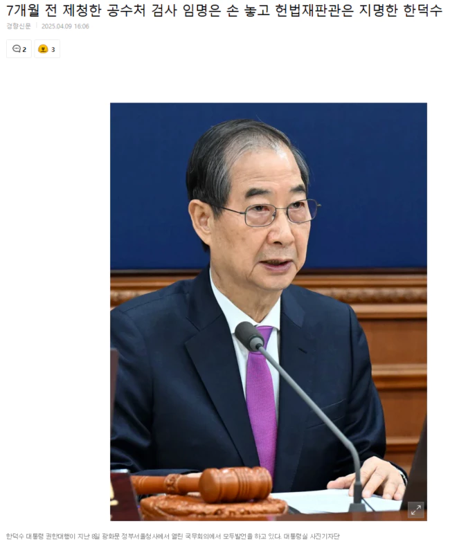 지난 8일 대통령 몫의 헌법재판관 후보자를 지명한 한덕수 대통령 권한대행 겸 국무총리가 정작 7개월 전 고위공직자범죄수사처(공수처)가 임명을 제청한 검사는 아직도 임명하지 않아 논란이 일고 있다. 공수처는 반년가량 검사 정원 25명 중 11명이 비어있다.
