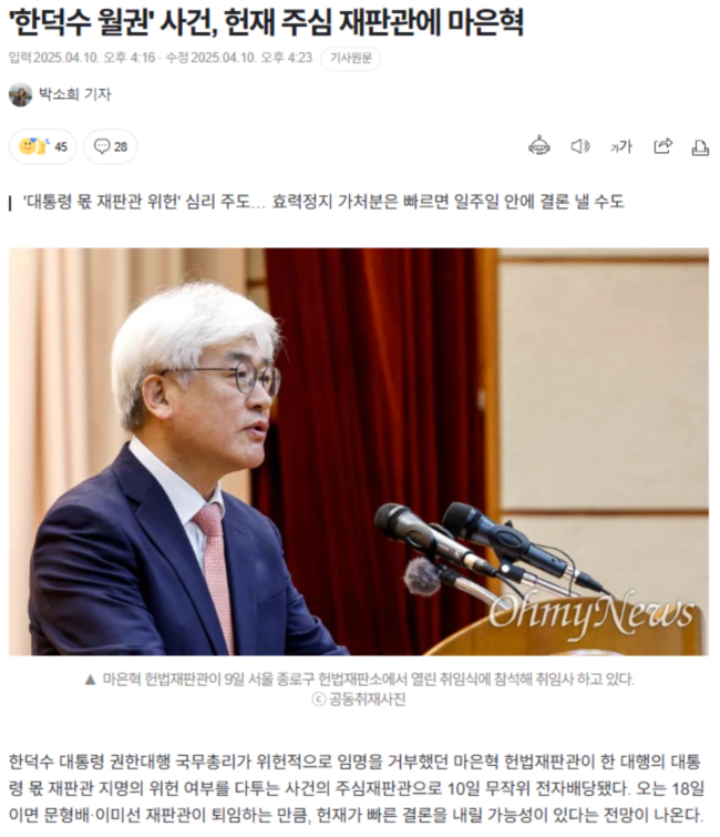 공교롭게도 이 사건 주심을 맡게 된 마은혁 재판관은 지난해 12월 국회에서 선출됐지만 한 대행이 '여야 합의'를 내세워 임명을 거부했던 인물 중 하나다. 이 일로 한 대행은 국회로부터 탄핵소추까지 됐으며, 복귀 후에도 마 재판관 임명을 상당기간 미뤘다.