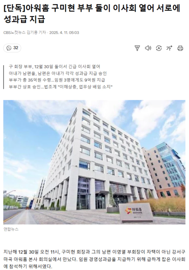 그런데 참석한 인원이 구 회장 부부와 감사 한 명, 총 세 명 뿐이었다. 회의실이 크게 느껴질 정도였다. 이날 이사회에 올라온 첫 번째 안건은 구 회장에 대한 경영성과급 20억 원 지급 건이었다. 하지만 구 회장은 이해상충 문제로 본인 안건 의결에는 참여할 수 없었다. 상법상 위법 행위다. 대신 그의 남편인 이 부회장이 찬성표를 던졌다. 통과됐다. 두 번째 안건은 반대로 남편 이 부회장에 대한 경영성과급 15억 원 지급 건이었다. 역시 이해상충 문제로 의결에 참여할 수 없는 남편을 대신해 구 회장이 찬성표를 던졌다. 이들은 내친김에 이영표 경영총괄 사장 등 임원 3명에 대한 성과급 약 9억 원 지급 건도 모두 통과시켰다. 모두 약 45억 원의 성과급 지급이 승인되는 데 10분이 채 걸리지 않았다. 지난해 매출 2조2440억 원이라는 사상 최대 실적을 낸 국내 대표 급식업체에서 말 그대로 진풍경이 펼쳐졌다. 11일 CBS노컷뉴스 취재를 종합하면, 이날 이사회에는 아워홈 전체 이사 세 명 중 구 회장 부부 두 명만 참석했다. 참석하지 않은 이사 한 명은 구 회장의 친오빠인 구본성 전 부회장의 장남 구재모 사내이사로 알려졌다. 구재모 이사의 부친 구본성 전 부회장은 회삿돈 횡령 및 배임 혐의로 1심에서 유죄를 선고 받고 현재 2심 재판 중이다. 따라서 이날 안건을 통과시키기 위해서는 출석 이사(2명)의 과반수(2명) 찬성이 필요했다. 그러나 본인의 성과급 지급 안건의 경우 이해상충의 문제로 본인은 의결에서 빠지기 때문에 남은 한 명의 찬성표만 있으면 된다. 결국 남편이 아내를, 아내가 남편의 성과급을 승인해준 꼴이 됐다. - 부부간 상호 승인?…"이해상충, 업무상 배임 소지" 법조계에서는 이처럼 부부간 상호 승인 구조 역시 실질적 이해상충이자 업무상 배임 소지가 있는 사안이라고 지적한다. 상법상 이사회 결의에 관해서 특별한 이해관계가 있는 자는 의결권을 행사하지 못한다고 명시돼 있다. 부부가 서로를 대신해 의결에 참여했다면 이는 실질적 이해상충에 해당할 수 있고, 이사로서의 충실의무를 위반한 행위로 볼 수 있다는 지적이 나오는 이유다. .. 후략 ..