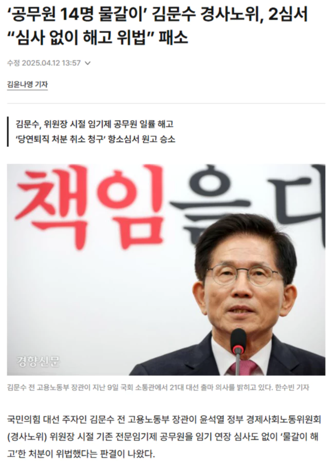 A씨는 2022년 4월 전문임기제 공무원에 채용돼 같은해 6월부터 11월까지 경사노위 의제조사와 분석담당 전문위원으로 계약했다. 그런데 김 전 장관이 경사노위 위원장에 취임한 직후인 2022년 10월 전문임기제 공무원 14명 전원에게 ‘11월 말 임용 약정기간이 끝난다’는 이유로 당연 퇴직을 통보했다.