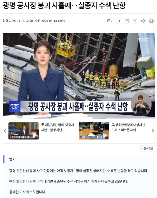 | '광명 지하터널 붕괴' 실종자 1명 극적 생환.. 사고 발생 13시간 만 (0) | 2025.04.12 |