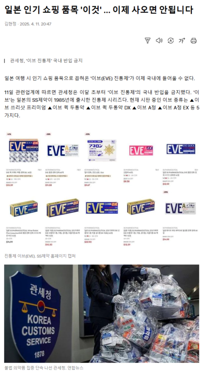 생리통 등에 효과가 좋다고 입소문이 나면서, 여성 일본 여행객들 사이에서 반드시 사와야 할 제품으로 오랜 기간 인기를 끌었다. 문제가 된 건 이브 진통제에 포함된 '알릴이소프로필아세틸우레아(알릴이소프로필아세틸요소)' 성분이다.