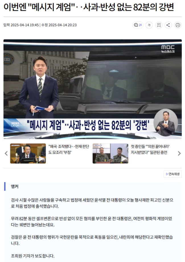 '2024년 봄부터 계엄을 사전 모의했다'는 검찰 공소사실에 대해서도 "코미디 같은 일"이라며 "계엄 선포는 자유민주주의를 지키기 위한 것"이라는 주장을 되풀이했습니다.