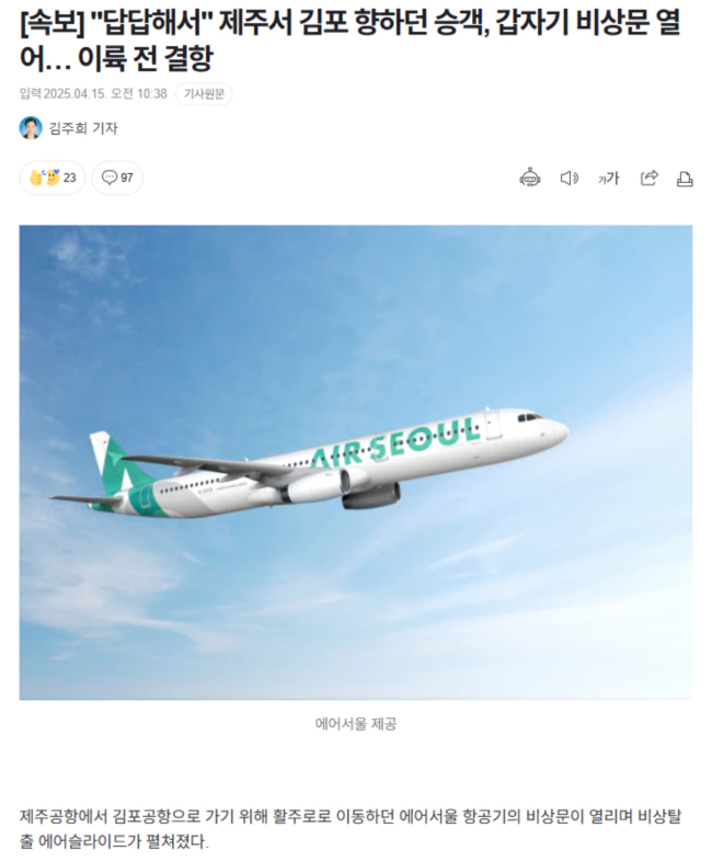 15일 한국공항공사 등에 따르면 이날 오전 8시 15분께 에어서울 RS902편이 승객 202명을 태우고 제주에서 김포로 가기 위해 유도로를 따라 활주로로 이동하던 중 오른쪽 앞 비상탈출 슬라이드가 갑자기 개방됐다.