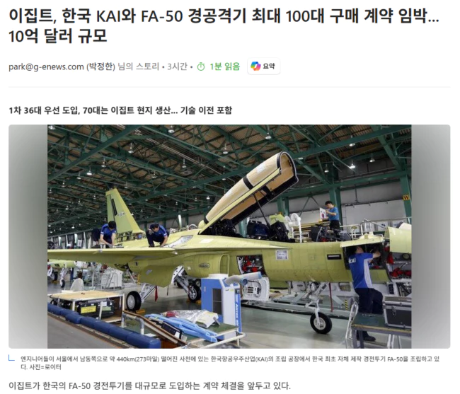 (출처 : 이집트, 한국 KAI와 FA-50 경공격기 최대 100대 구매 계약 임박... 10억 달러 규모)