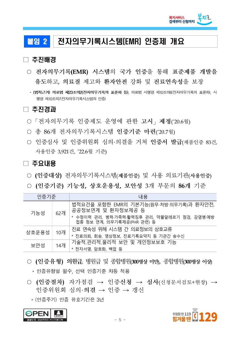 * 전자의무기록 시스템 인증제 : 환자 안전과 진료 연속성을 보장하기 위하여, 의료기관이 환자의 진료정보를 기록한 전자의무기록시스템 표준 적합성 여부 등을 확인하고 인증을 부여하는 제도