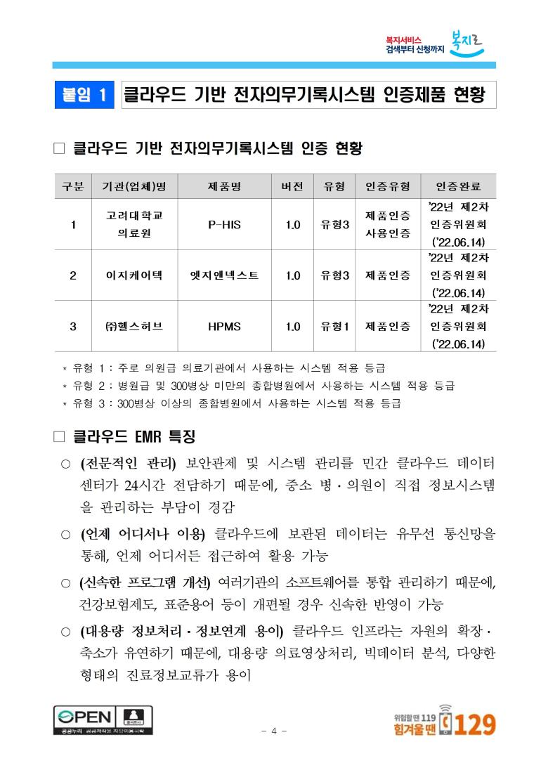 □ 보건복지부 이형훈 보건산업정책국장은 “이번 클라우드 전자의무기록시스템(EMR) 인증을 계기로, 의료기관에 민간 클라우드 도입이 확대되고, 클라우드 EMR을 이용한 디지털 전환도 한층 가속화 할 것으로 기대된다.”라고 밝혔다.
