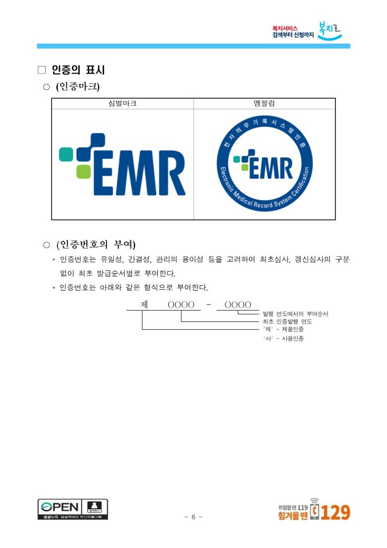 ○ 인증된 전자의무기록시스템(EMR) 제품을 사용하는 의료기관은 누리집(emrcert.mohw.go.kr)을 통해 공개되며, 의료기관에 게시된 전자의무기록시스템(EMR) 인증 표시를 통해서도 확인할 수 있다.