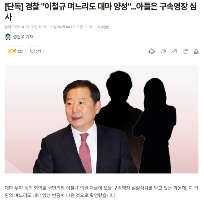 서울 서초경찰서는 국립과학수사연구원 감정에서 이 의원의 며느리인 A 씨도 대마 양성 반응이 나왔다고 밝혔습니다.