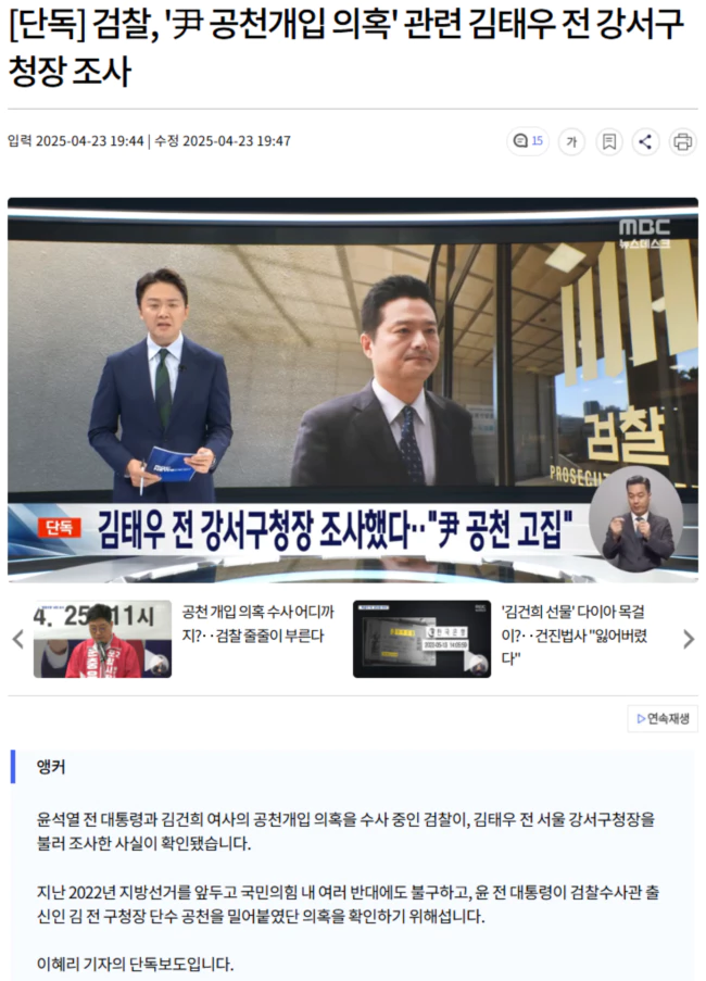 검찰은 지난 2022년 6.1 지방선거를 앞두고 윤석열 전 대통령이 강서구청장 공천에 개입했는지 김 전 구청장에게 확인한 것으로 파악됐습니다.