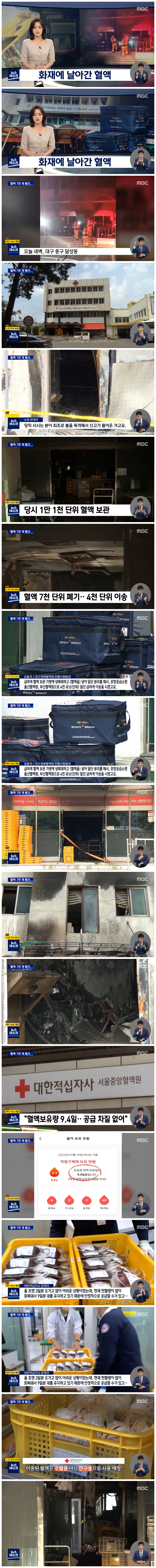 헌혈자들이 기증한 혈액 만 천 단위가 보관돼 있었는데, 이 화재로 보관 온도에 문제가 생기면서 7천 단위의 혈액이 폐기 처분됐습니다.
