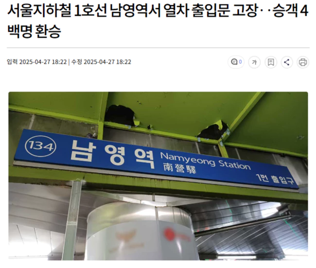 오늘(4/27) 오후 5시쯤 서울 지하철 1호선 전동열차의 출입문이 고장 나 승객들이 후속 열차로 환승하는 소동이 빚어졌습니다.