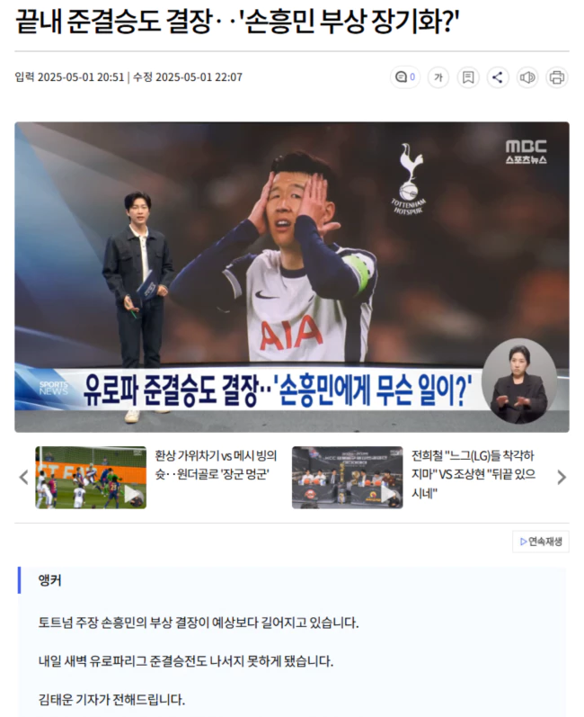 | 준결승 2차전도 결장 유력.. "아직 개인 훈련 중" (0) | 2025.05.04 |
