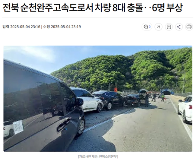 오늘(5/4) 오후 3시 반쯤, 전북 완주군 상관면 순천완주고속도로 상행선 용암3터널 인근에서 승용차 8대가 추돌해, 6명이 다쳤습니다.