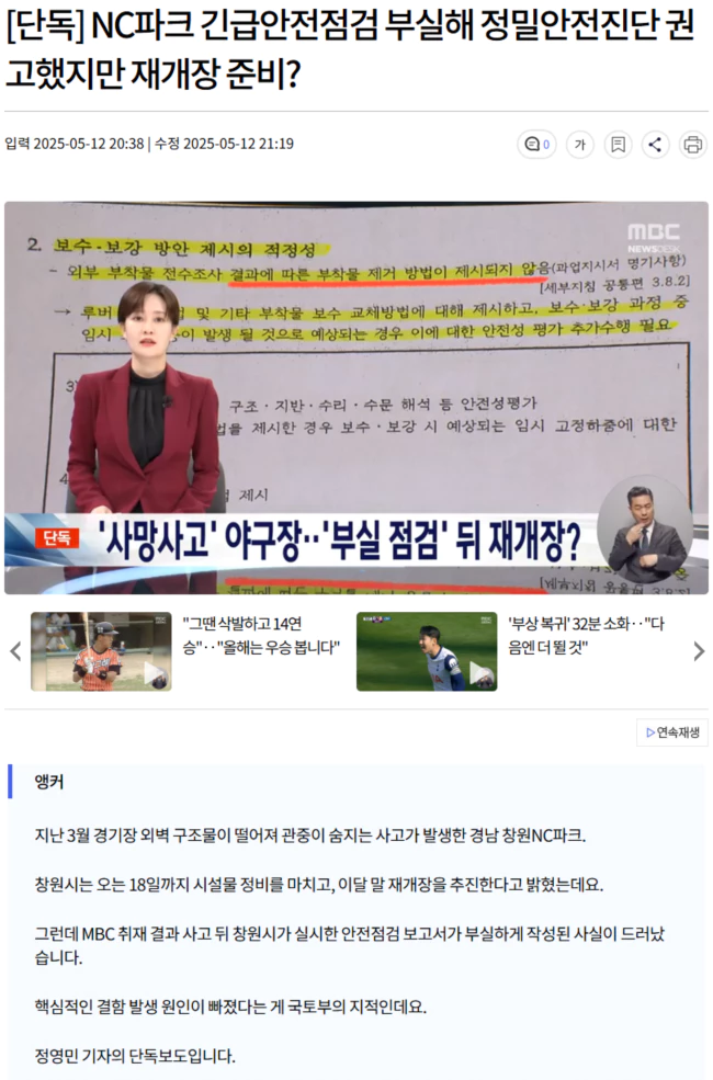 국토부는 준공 6년 차인 NC파크에 대해 10년 이상 된 건축물에 적용하는 정밀안전진단을 실시하라고 요청했습니다.