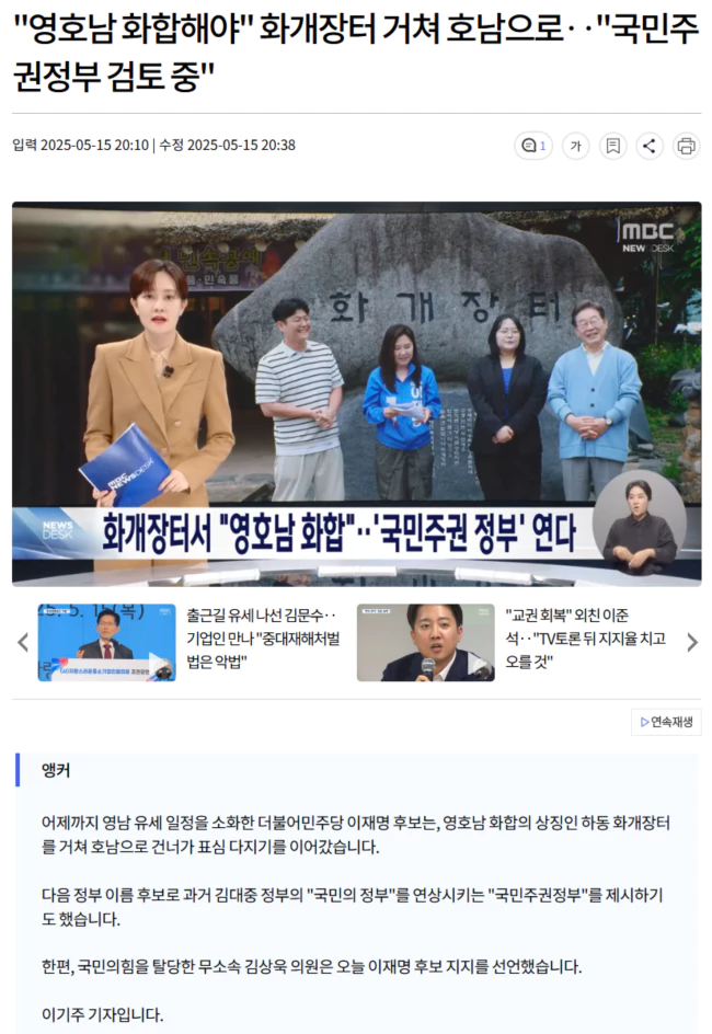 또, 호남 출신 김대중 정부가 '국민의 정부'를 내세웠던 것을 상기시키며, 내란을 극복하는 다음 정부 이름 후보로 '국민주권정부'을 제시했습니다.