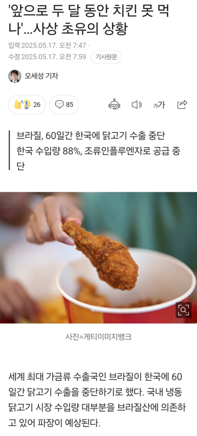 국내 냉동 닭고기 시장 수입량 대부분을 브라질산에 의존하는 한국도 큰 영향을 받을 전망이다. 브라질 농림축산부 장관은 별도 발표에서 "(조류인플루엔자 발생 등의 경우) 한국, 중국, 유럽연합(EU)에 대해 60일간 닭고기 수출 금지 조처를 해야 한다는 프로토콜이 있다"며 "우리는 해당 국가의 통지를 기다리고 있다"고 말했다.