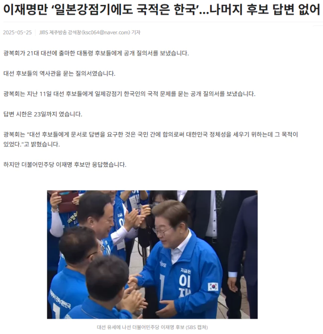 이 후보는 일제의 국권 침탈이 원천적으로 불법 무효인지에 대한 물음에 "일제의 국권침탈은 완전한 불법이며 무효이다. 114년 전 일제는 한일 병합조약을 내세워 대한제국을 강제 점령했으며, 우리 국민 의사에 반해 대한민국의 국권을 침탈했다"고 밝혔습니다.