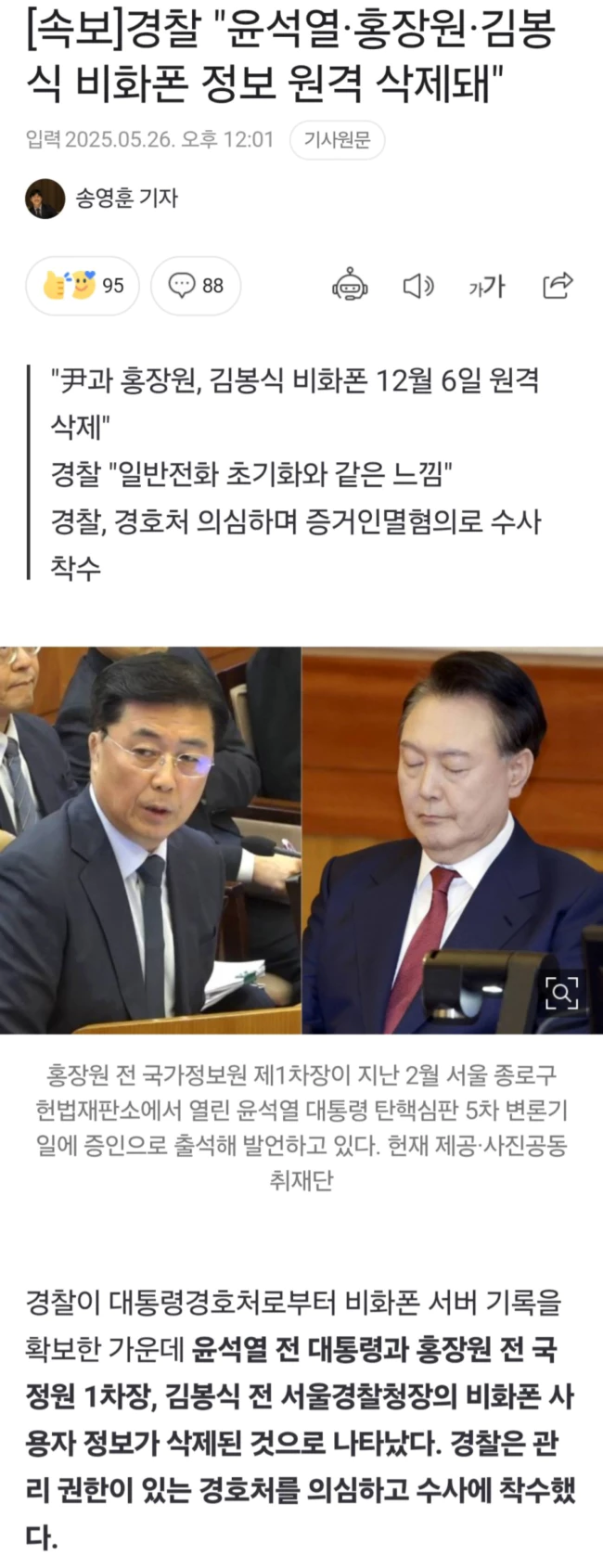 경찰은 서버에 누군가 접근해 삭제한 것으로 보고 있는데, 관리 권한이 있는 경호처를 의심하고 있다. 경찰 관계재는 '경호처에서 삭제한 것인가'라는 질문에 "그렇게 보고 있다"고 답했다.