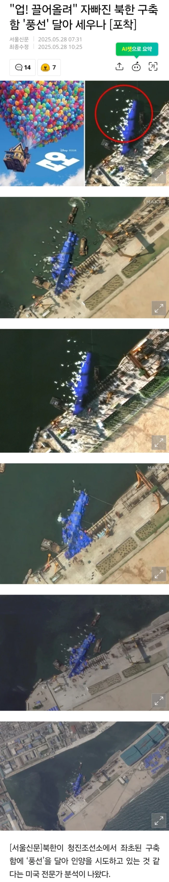 에벌레스는 “북한은 2009년 개봉된 픽사의 히트작 ‘업’에서 영감을 받은 방법으로 구축함을 들어 올리려고 시도 중인 것으로 보인다”며 “구축함 상공에 떠 있는 수많은 풍선을 주목하라”라고 했다.