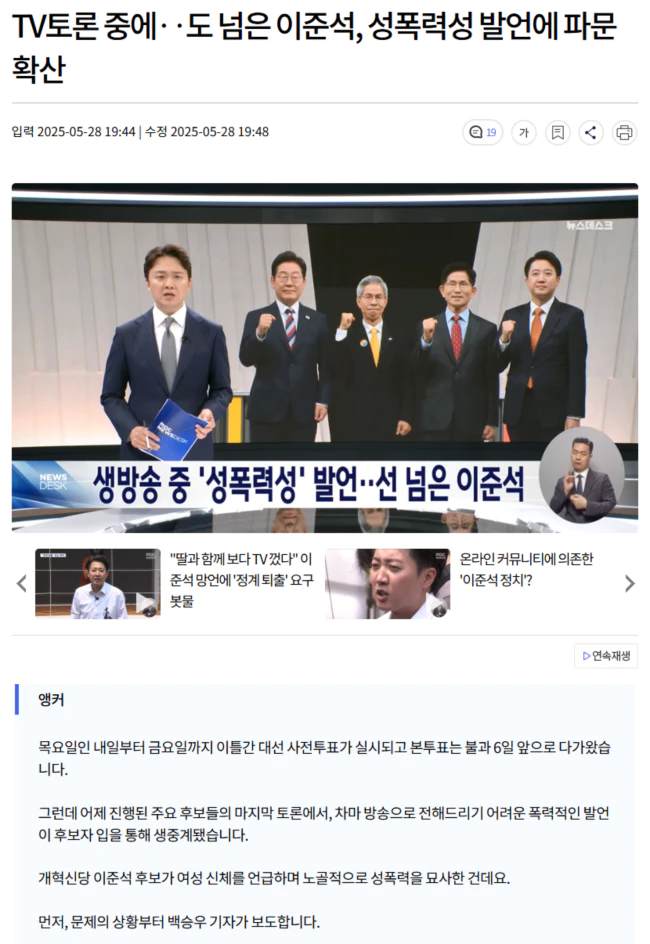| 이준석, ‘이재명’ 거론하며 물타기.. 반성 없이 2차 가해 계속 (0) | 2025.05.29 |