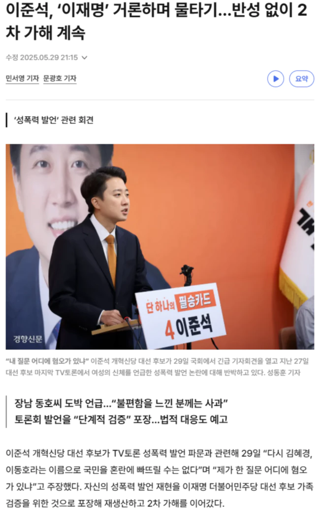이준석 후보는 “워낙 심한 음담패설에 해당하는 표현들이라 정제하고 순화해도 한계가 있었다. 그마저도 불편함을 느끼신 분들께 진심으로 사과드린다”면서도 이재명 후보에 화살을 돌렸다. 그는 “가장 심각한 문제는 이재명 후보”라며 “해당 표현은 제가 창작한 것이 아니라 이재명 후보 장남 이동호씨가 인터넷 커뮤니티에 직접 올린 글의 일부”라고 했다. 또 자신의 발언은 “단순한 자극이 아닌 단계적 검증” “공적 책임의 연장선”이라고 주장했다.