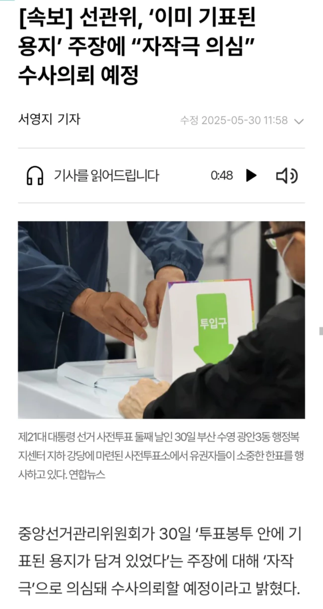 중앙선관위는 “오전 7시께 경기도 용인시 수지구 성복동 사전투표소에서 선거인에게 교부한 관외사전투표 회송용봉투에 특정 후보자에게 기표한 투표지가 들어가 있었다는 내용의 언론보도가 있었다”며 “이는 해당 선거인이 타인으로부터 기표한 투표지를 전달받아 빈 회송용봉투에 넣어, 투표소에서 혼란을 부추길 목적으로 일으킨 자작극으로 의심되어 수사의뢰할 예정”이라고 밝혔다.