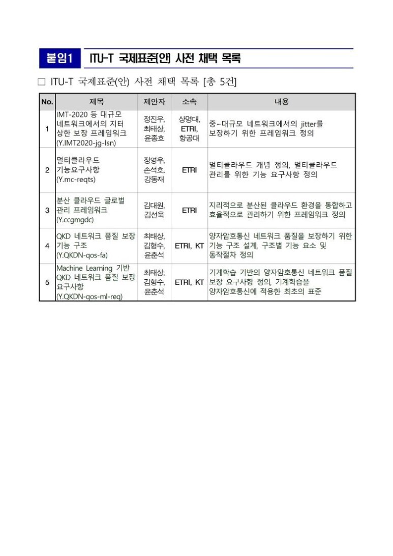 한국 제안 5세대(5G), 클라우드컴퓨팅, 양자암호통신기술 관련 국제전기통신연합 국제표준(안) 5건 채택