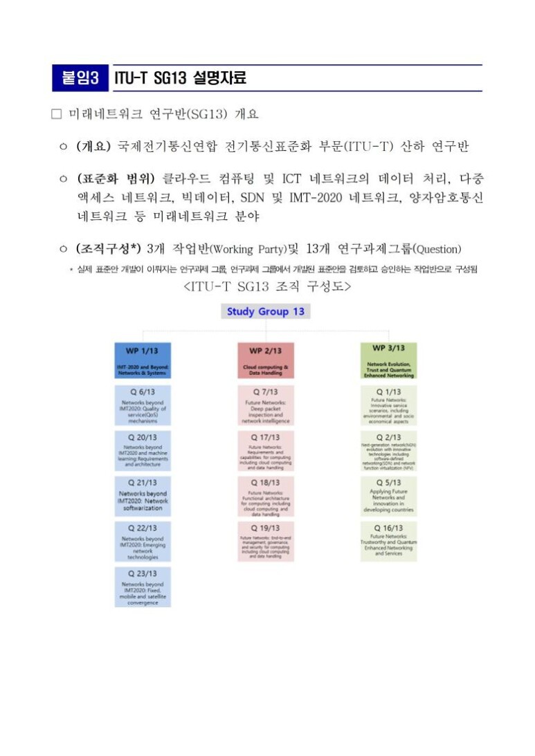 □ 과학기술정보통신부(장관 이종호) 국립전파연구원은 7월 4일부터 15일까지 스위스 제네바에서 개최된 “국제전기통신연합 전기통신표준화 부문(ITU-T) 미래네트워크 연구반(SG13*) (한국대표단 수석대표: KT 김형수 박사)회의에서 우리나라 주도로 개발한 5세대(5G), 클라우드컴퓨팅, 양자암호통신 분야의 관련한 국제표준(안) 5건이 사전 채택**되고, SG13 국제의장단 11석을 확보했다.”고 밝혔다.
