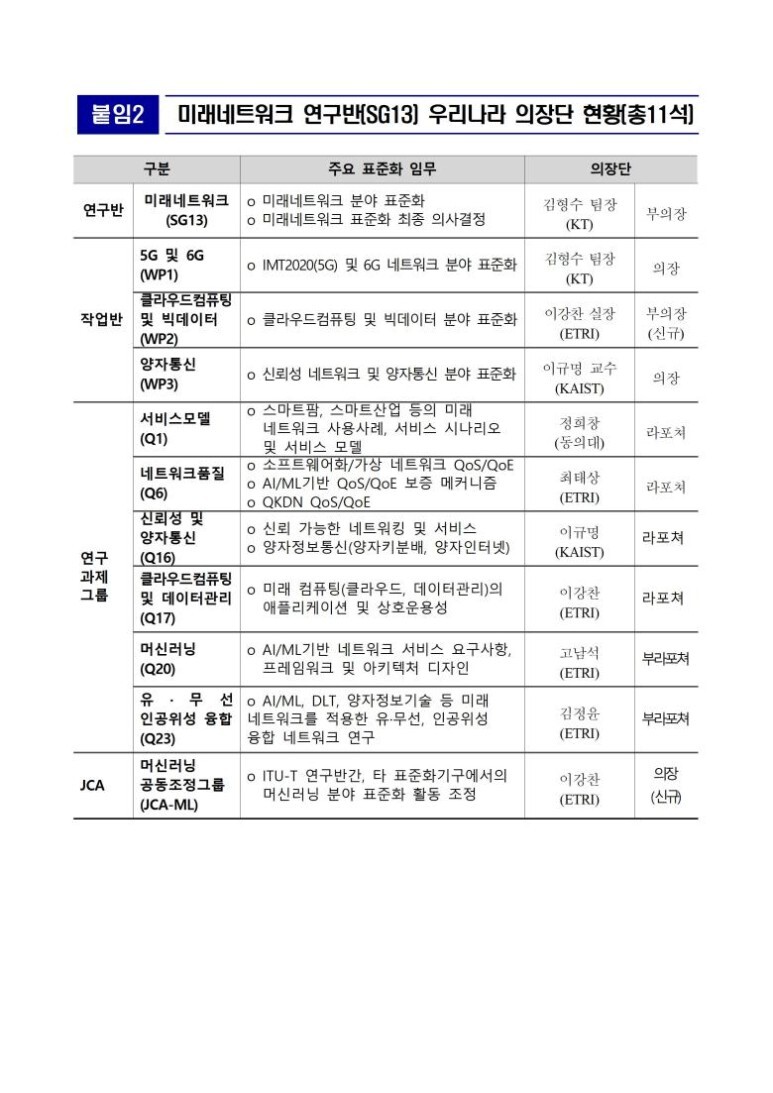 □ 우리나라는 SG13 의장단 11석을 확보하였으며, 9석은 재선임되었고 클라우드·빅데이터 분야 작업반과 우리나라 주도로 신설된 머신러닝 공동조정그룹(JCA-ML*) 의장단 등 2석에 추가 진출하는 성과를 이루었다.