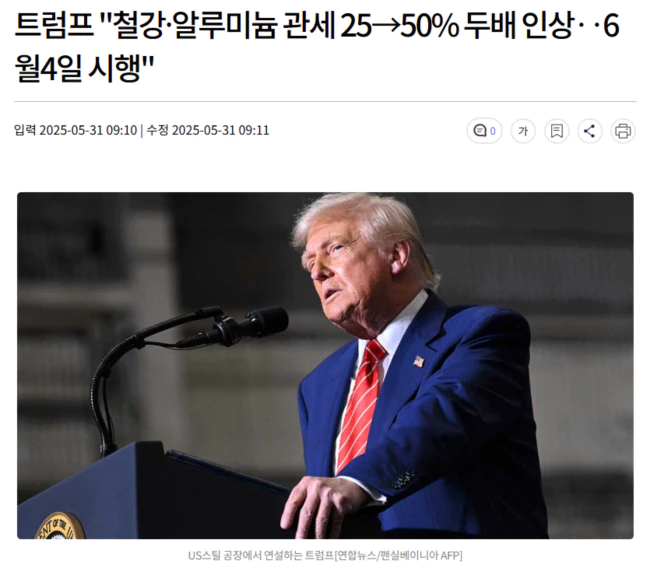 도널드 트럼프 미국 대통령은 현지시간 30일 미국으로 수입되는 외국산 철강·알루미늄 제품에 부과 중인 25%의 관세를 50%로 인상하겠다고 밝혔습니다.