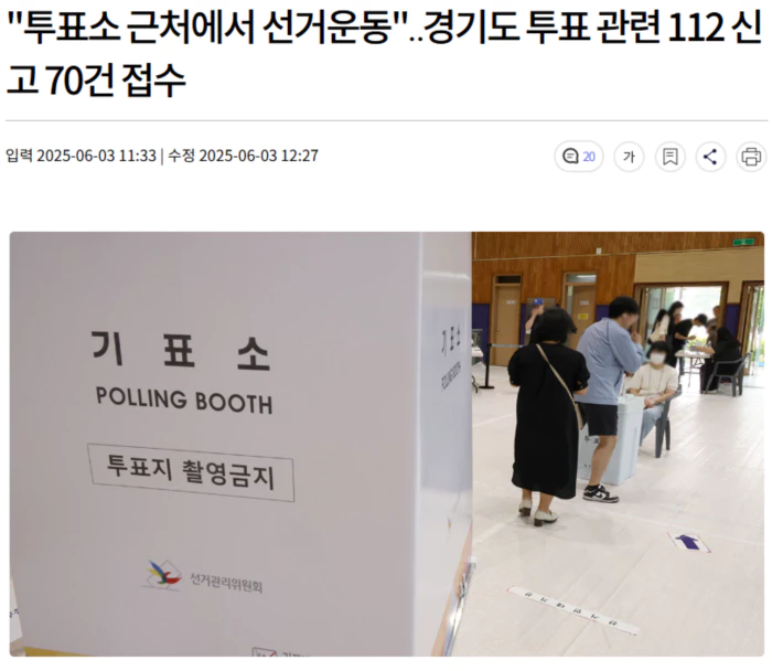 경기남부경찰청에 따르면 오늘 오전 6시 10분쯤 이천시 안흥동 이천중학교 투표소에선 "금지된 선거운동을 하고 있다"는 신고가 접수됐는데, 경찰 확인 결과 단순 투표 독려 활동으로 나타났습니다.