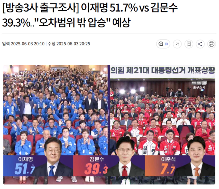 MBC 등 지상파 3사가 공동 실시한 21대 대통령선거 출구조사에서 더불어민주당 이재명 후보가 국민의힘 김문수 후보를 오차범위 밖에서 앞서는 것으로 나타났습니다.