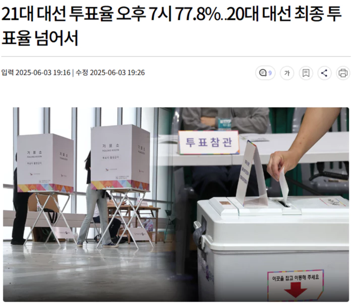| 21대 대선 투표율 79.4% 잠정 집계.. 28년 만에 최고치 (0) | 2025.06.03 |