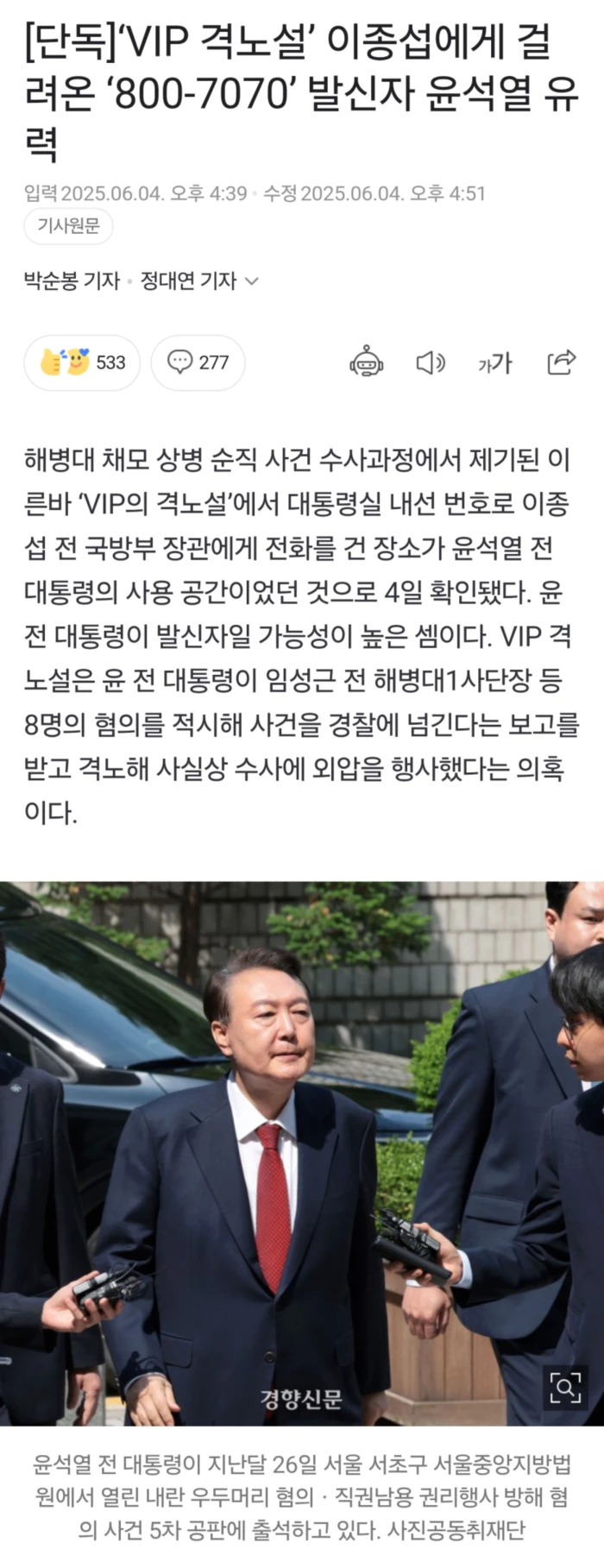경향신문 취재 결과, 채 상병 순직사건 수사 외압 의혹을 수사 중인 고위공직자범죄수사처(공수처)는 ‘VIP 격노설’ 당일인 2023년 7월31일 ‘02-800-7070’으로 이 전 장관에게 전화를 건 발신 장소가 윤 전 대통령의 사용 공간인 부속실 혹은 집무실이었다는 사실을 확인했다. 해당 번호는 윤 전 대통령이 사용하는 여러 공간에서 공유된 것으로 전해졌다. 전화를 건 시각이 오전 11시54분으로 근무 시간이었다는 점을 감안하면 윤 전 대통령 본인이 사용했을 가능성이 높다. 공수처 수사3부(부장 이대환)는 앞서 지난달 7~8일 용산 대통령실과 국가안보실을 압수수색했고, 대통령실의 협조를 받아 ‘02-800-7070’ 통신 서버 기록을 확보했다. 이후 서버 기록 등을 통해 발신 장소를 특정했다. 이 전 장관은 해당 내선 번호로 걸려온 전화로 168초 동안 통화했다. 윤 전 대통령은 격노설 이후인 2023년 8월2일 총 4차례 이 전 장관에게 휴대전화로 직접 전화를 걸었다. 공수처는 이 전 장관이 윤 전 대통령의 전화를 받고 채 상병 순직 사건의 경찰 이첩을 보류하라는 지시를 내린 것으로 보고 있다. .. 후략 ..