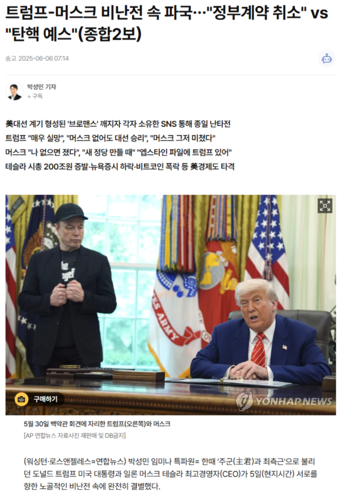 트럼프 대통령은 공개석상 발언과 자신이 설립한 소셜미디어(SNS) 트루스소셜을 통해, 머스크 역시 자신 소유인 엑스(X·옛 트위터)를 무기로 하루 종일 공격 수위를 끌어올리면서 공개 설전을 이어갔다. 지난 대선 과정에서 머스크가 트럼프 대통령 재집권 성공의 '1등 공신'으로 대우받으면서 '끈끈한 브로맨스'를 자랑했던 두 사람의 관계가 파국을 맞은 것이다. 지난달 30일 머스크가 트럼프 행정부에서 특별공무원으로서 정부효율부(DOGE)의 연방정부 구조조정 작업을 수행하다 물러난 뒤 1주일도 안 된 시점이다. 포문은 트럼프 대통령이 먼저 열었다. 그는 이날 프리드리히 메르츠 독일 총리와 백악관 집무실에서 만난 자리에서 머스크가 자신의 감세 등 국정 어젠다를 반영한 법안에 공개적으로 반대한 데 대해 "매우 실망했다"고 밝혔다. 그는 "일론(머스크)과 나는 좋은 관계였다. 우리(관계)가 더 이상 좋을지 모르겠다. 나는 놀랐다"라고 말해 두 사람의 관계가 예전 같을 수 없음을 내비쳤다. 트럼프 대통령은 이어 "나는 일론을 많이 도와줬다"며 "그는 나에 대해 가장 아름다운 것들을 말했고 개인적으로 나에 대해 나쁘게 말하지 않았지만, 그것(나쁘게 말하는 것)이 다음 차례가 될 것이라 확신한다"고 덧붙였다. 트럼프 대통령은 머스크가 자신의 감세 법안을 비판한 이유로 전기차 보조금 혜택 폐지와, 머스크가 지지한 인사의 미 항공우주국(NASA) 국장 지명을 철회한 것, 정부효율부(DOGE) 수장 임기를 의도치 않게 끝내게 된 것 등을 꼽았다. .. 후략 ..