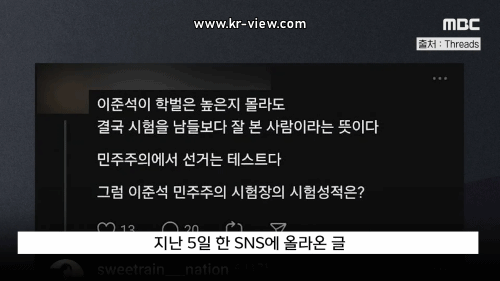누리꾼이 개혁신당 이준석 의원과 관련해 "이준석이 학벌은 높은지 몰라도 결국 시험을 잘 본 사람이라는 뜻"이라며 "민주주의에서 선거는 테스트인데, 이준석의 시험성적은?"이라고 썼습니다.