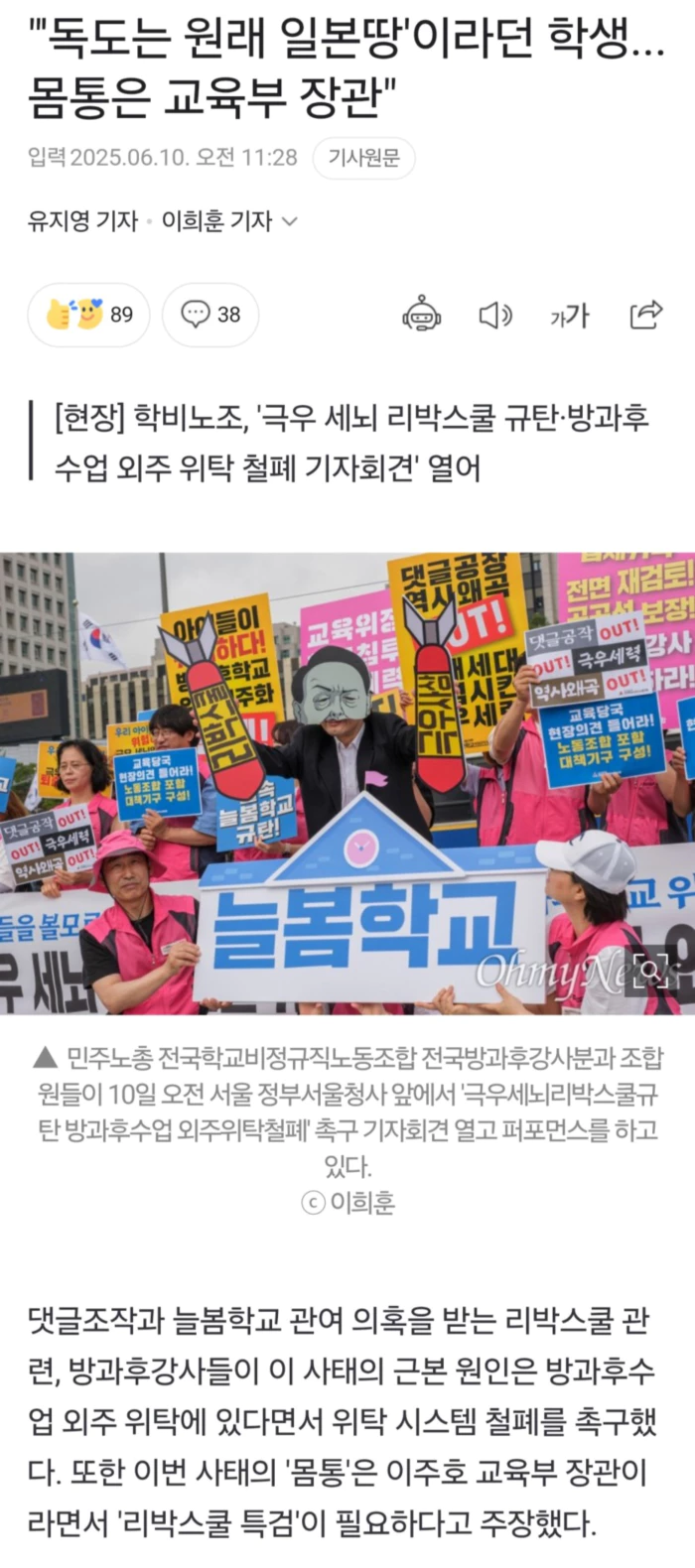 이 자리에서 방과후강사들은 "리박스쿨과 같은 반교육적 시도가 가능한 구조적 배경에 방과후학교의 무분별한 외주 위탁 운영이 자리하고 있다"라며 "부실한 수업 및 강사 수급 시스템의 맹점을 파고든 극우세력에 의해 늘봄 학교는 역사 왜곡 통로로 악용되고 말았다"라고 한탄했다.