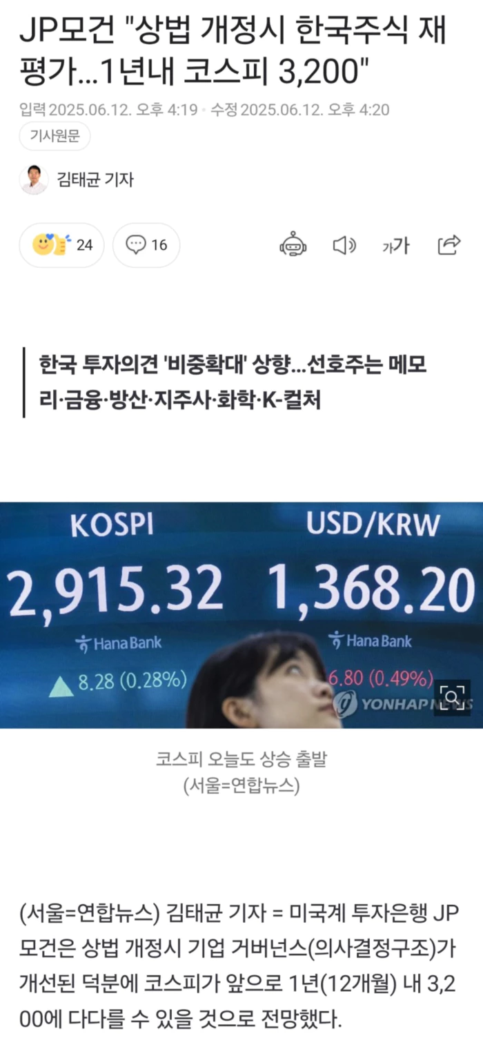 JP모건은 상법 개정에 따른 거버넌스 개선이 다소 시간이 걸리겠지만 이 영역에서의 진전이 60∼100%의 주식 재평가를 실현하는 데 도움이 될 수 있을 것으로 봤다.