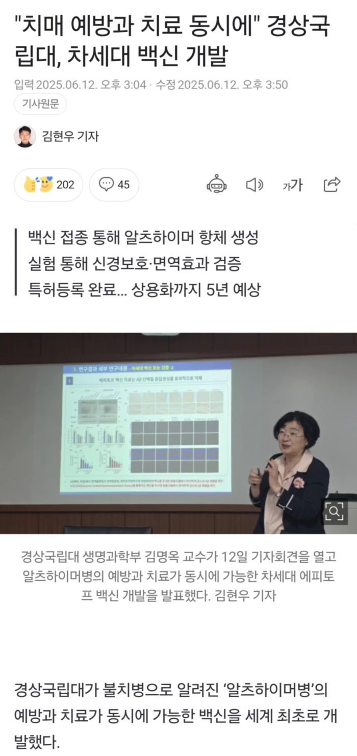 경상대 생명과학부 김명옥 교수 연구팀은 12일 기자회견을 열고 알츠하이머병의 예방과 치료가 동시에 가능한 차세대 ‘에피토프 백신’ 개발을 발표했다.